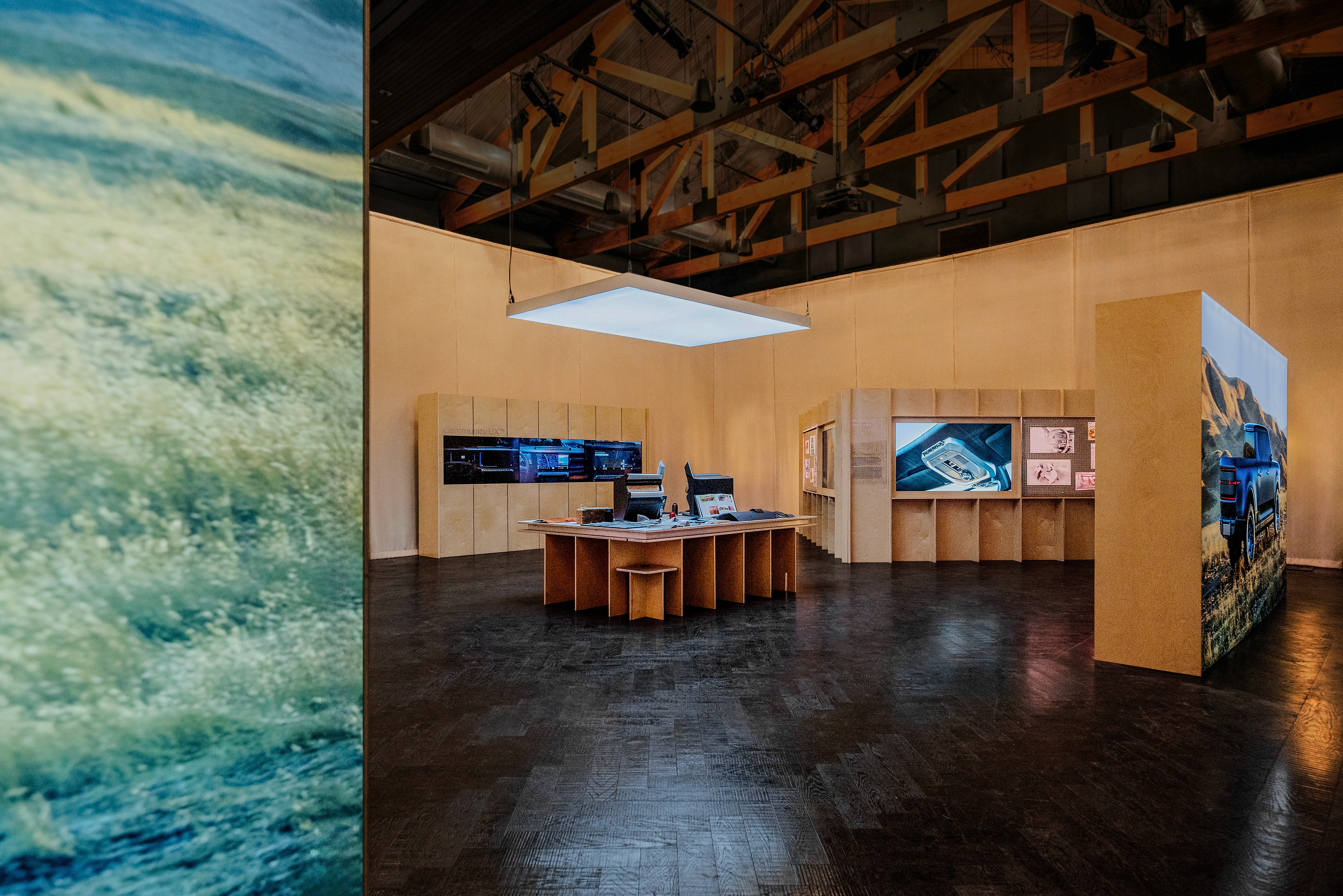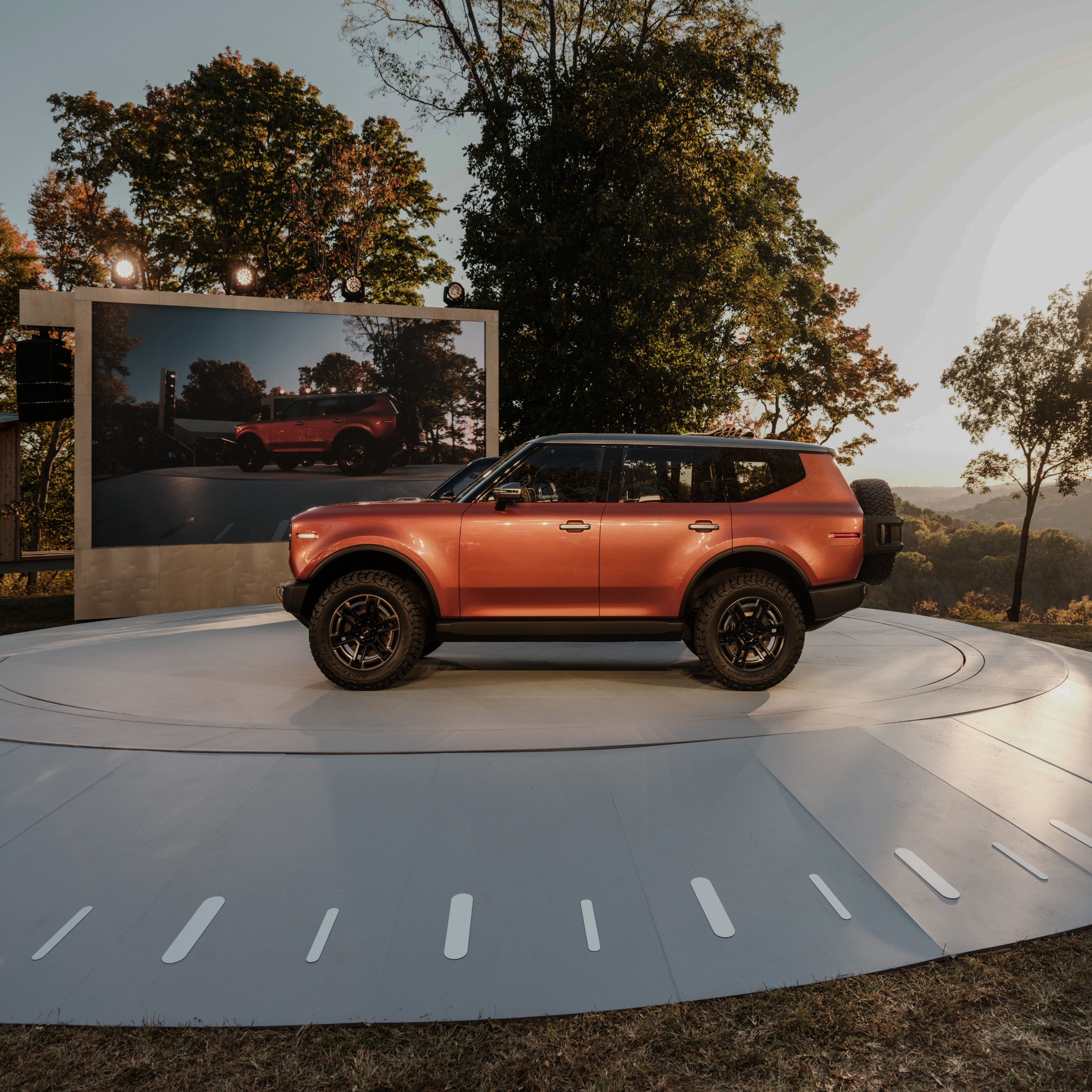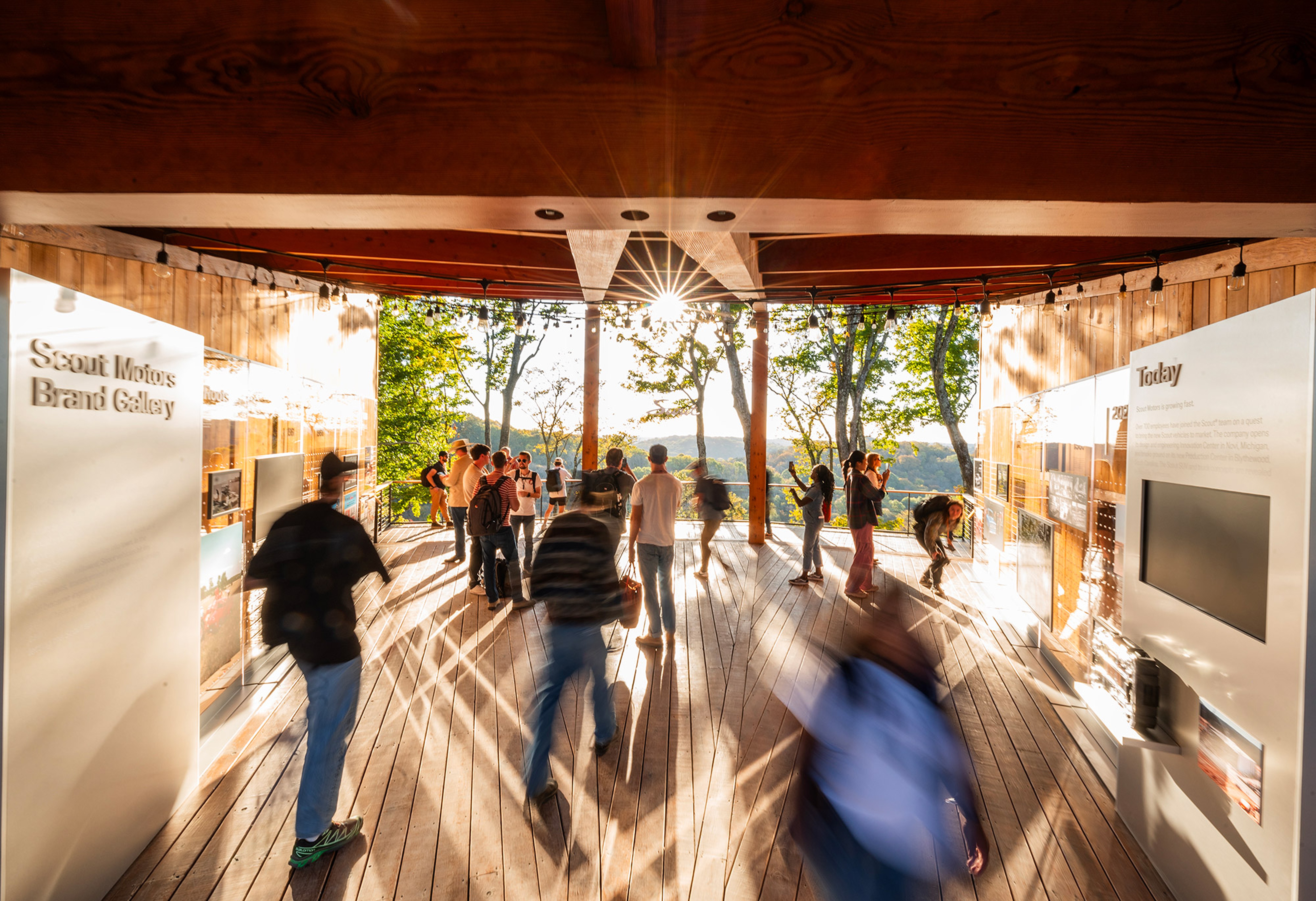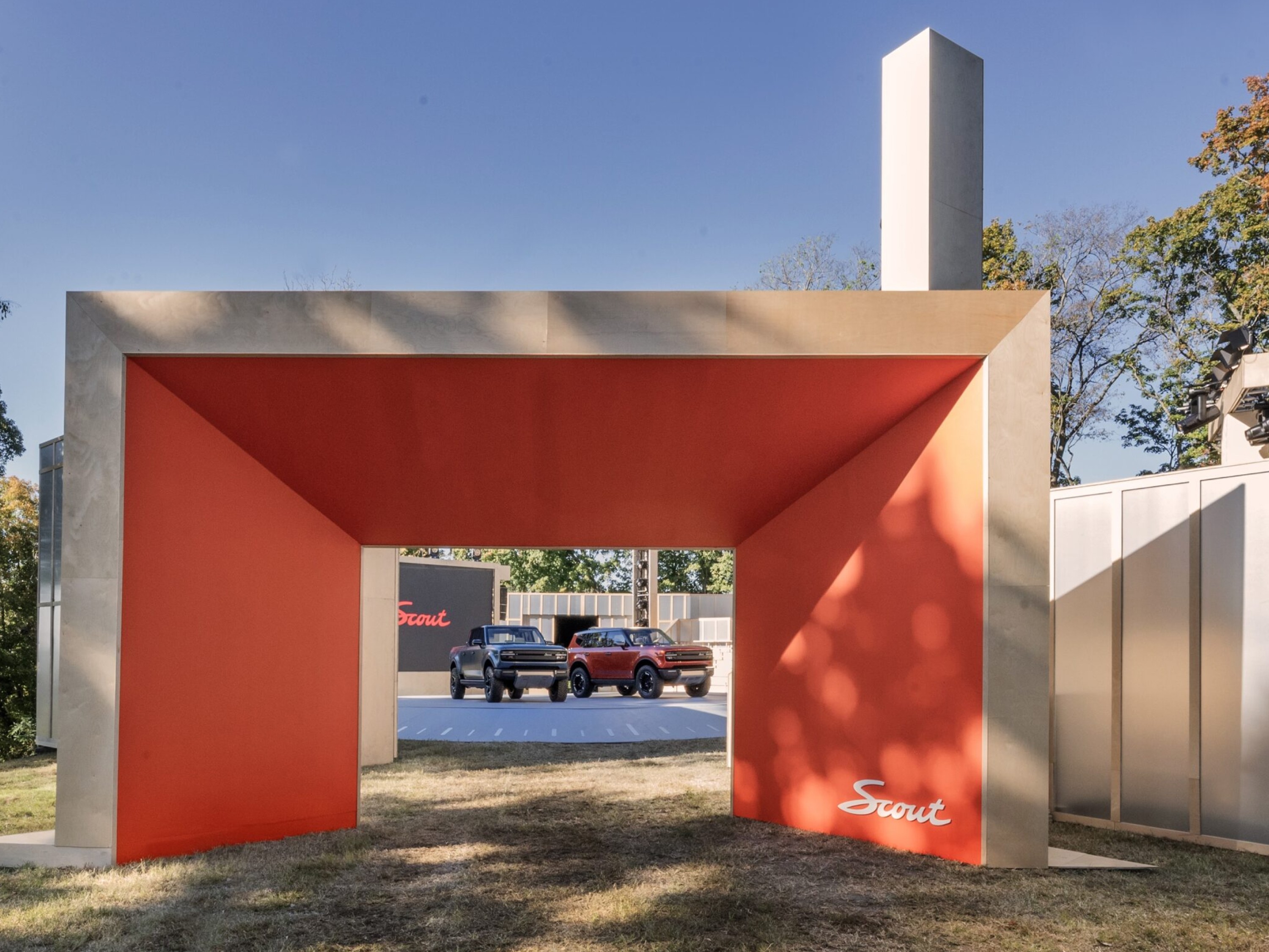 The identity was first tested through a major public launch and product reveal. A temporary landscape in Franklin, Tennessee was transformed into a 500 person reveal environment, designed as a compass and positioned within the geography of the Southeast. Wayfinding, spatial systems, custom gifted merch and a brand gallery were developed across the 352 acre site, guiding audiences through the legacy and future of Scout Motors.